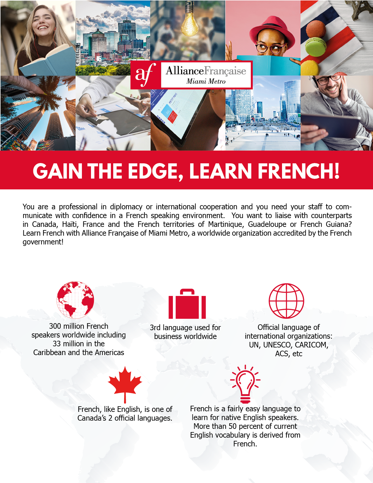 Alliance Française Miami Metro is an accredited center for international diplomas and certifications by France Education International and the "Chambre de Commerce et d'Industrie - Paris IDF"