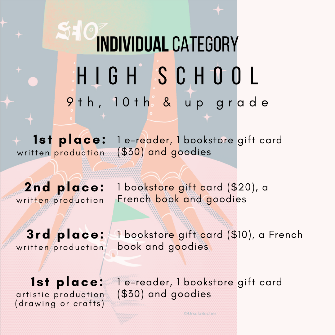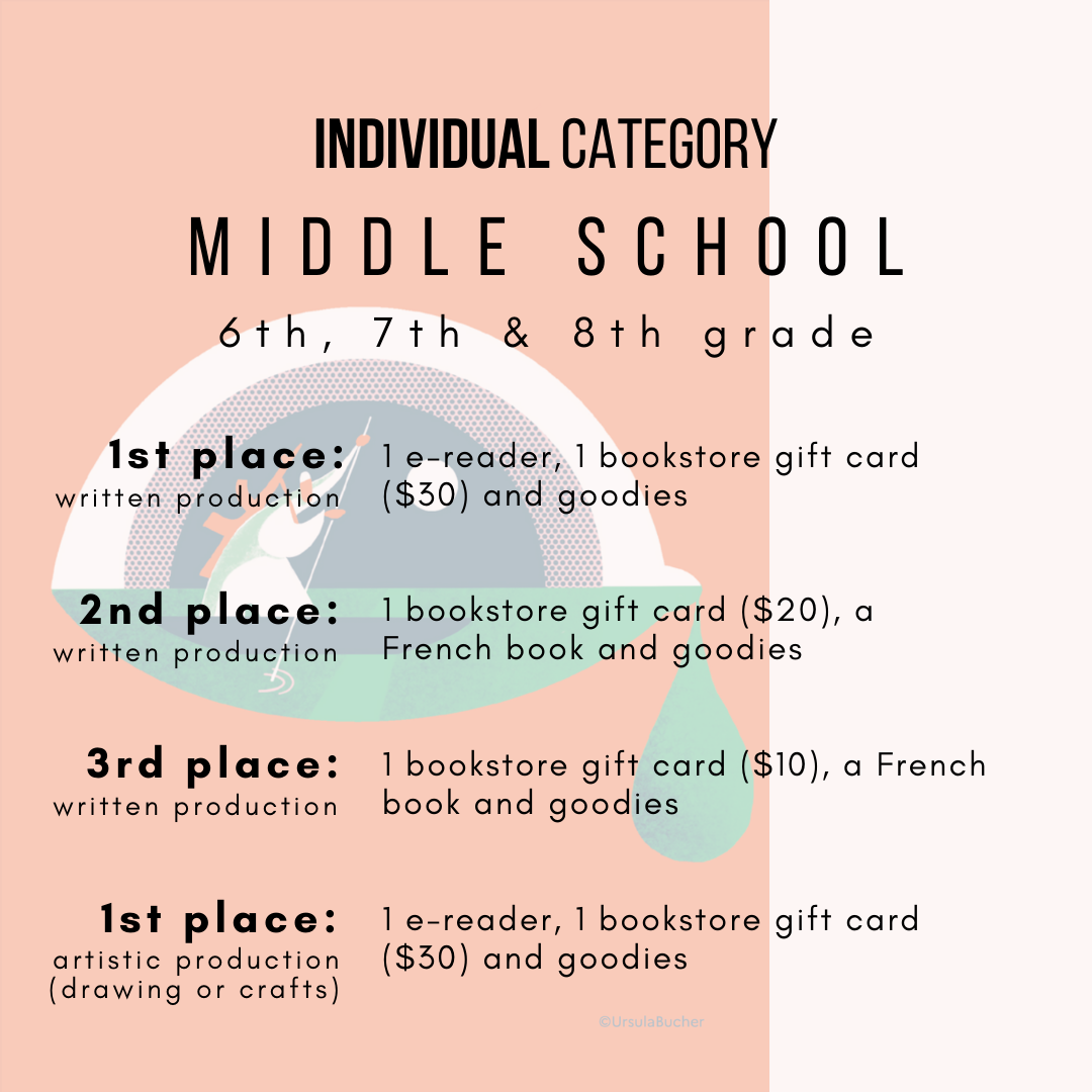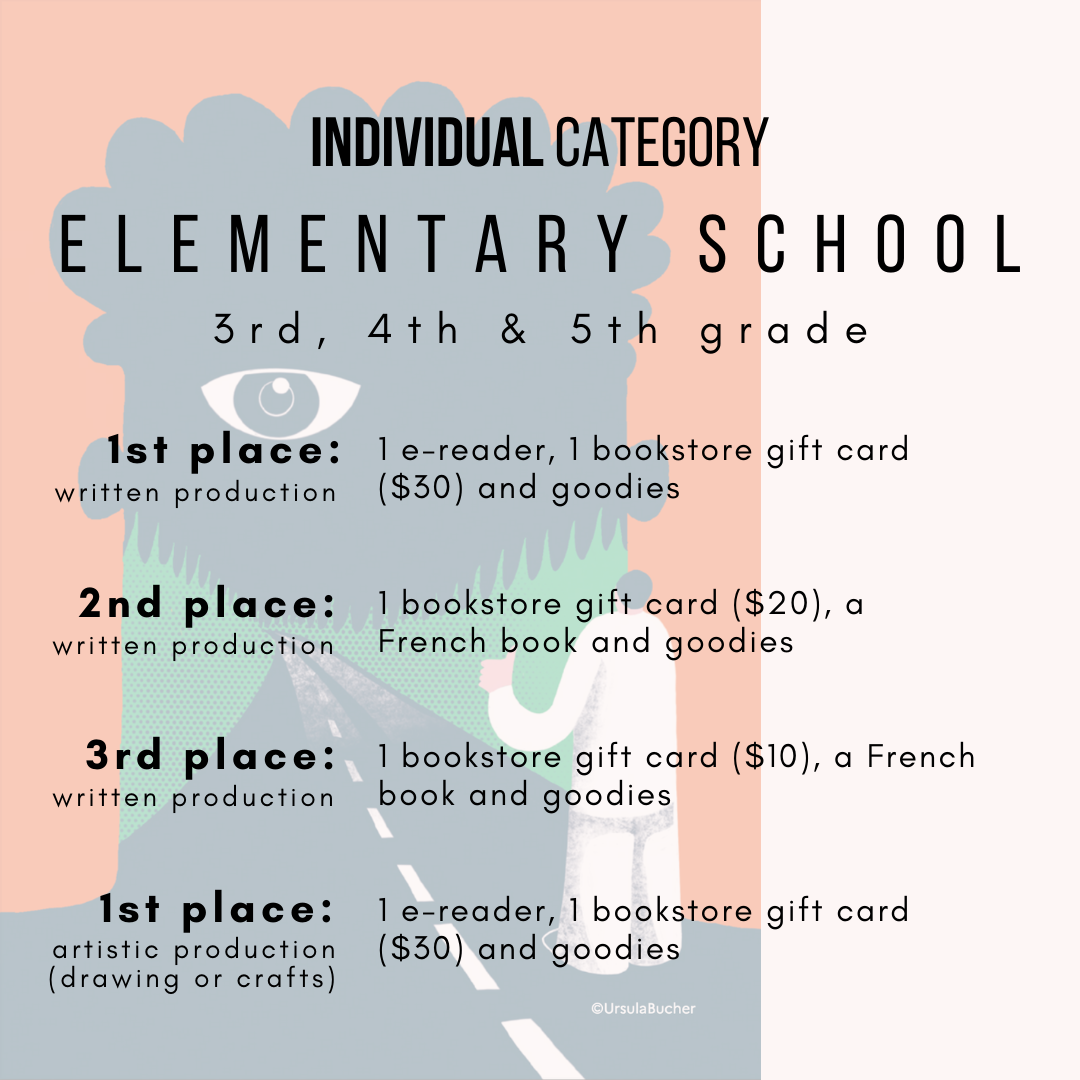 Students may participate individually in the categories listed above by submitting one single piece in one of